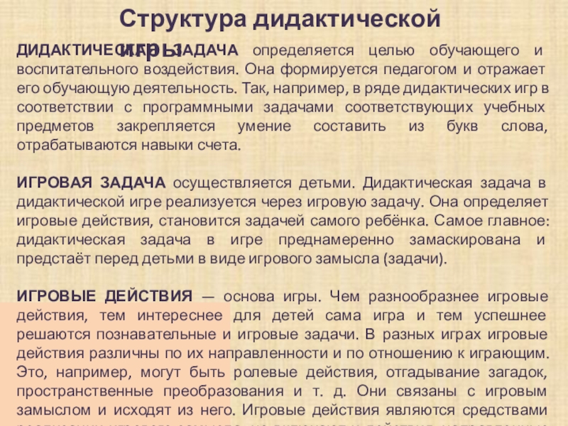 ИГРОВАЯ ЗАДАЧА осуществляется детьми. Дидактическая задача в дидактической игре реализуется через игровую задачу. Она определяет игровые действия, становится задачей самого ребёнка. Самое главное: дидактическая задача в игре преднамеренно замаскирована и предстаёт перед детьми в виде игрового замысла (задачи).