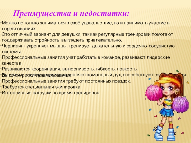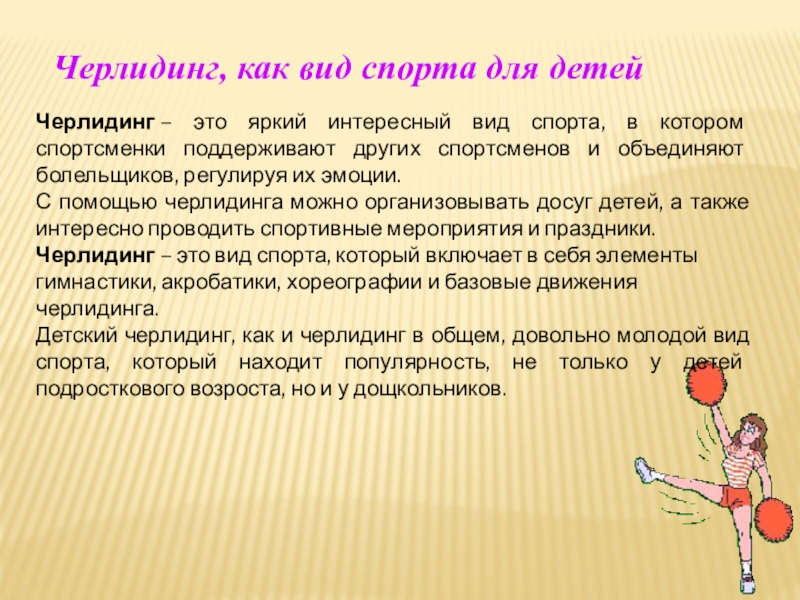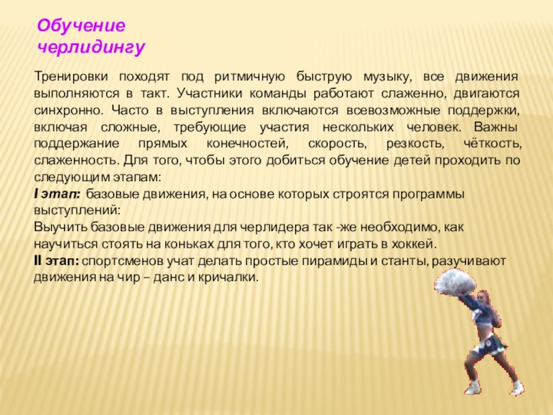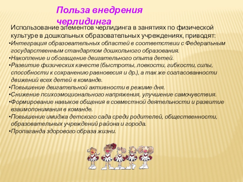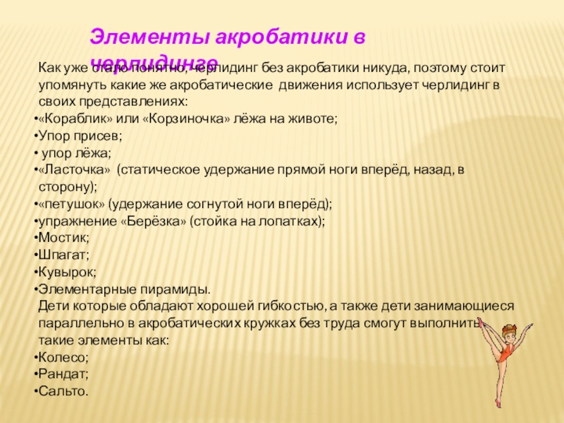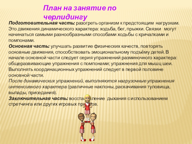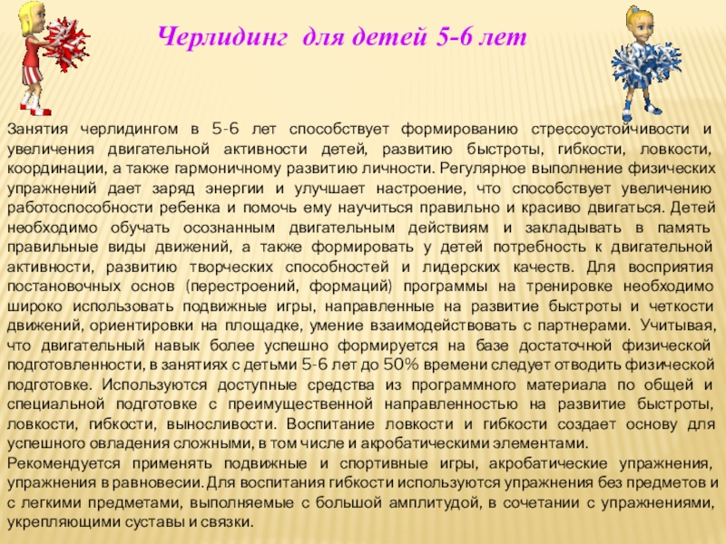 активности детей, развитию быстроты, гибкости, ловкости, координации, а также гармоничному развитию личности. Регулярное выполнение физических упражнений дает заряд энергии и улучшает настроение, что способствует увеличению работоспособности ребенка и помочь ему научиться правильно и красиво двигаться. Детей необходимо обучать осознанным двигательным действиям и закладывать в память правильные виды движений, а также формировать у детей потребность к двигательной активности, развитию творческих способностей и лидерских качеств. Для восприятия постановочных основ (перестроений, формаций) программы на тренировке необходимо широко использовать подвижные игры, направленные на развитие быстроты и четкости движений, ориентировки на площадке, умение взаимодействовать с партнерами. Учитывая, что двигательный навык более успешно формируется на базе достаточной физической подготовленности, в занятиях с детьми 5-6 лет до 50% времени следует отводить физической подготовке. Используются доступные средства из программного материала по общей и специальной подготовке с преимущественной направленностью на развитие быстроты, ловкости, гибкости, выносливости. Воспитание ловкости и гибкости создает основу для успешного овладения сложными, в том числе и акробатическими элементами.