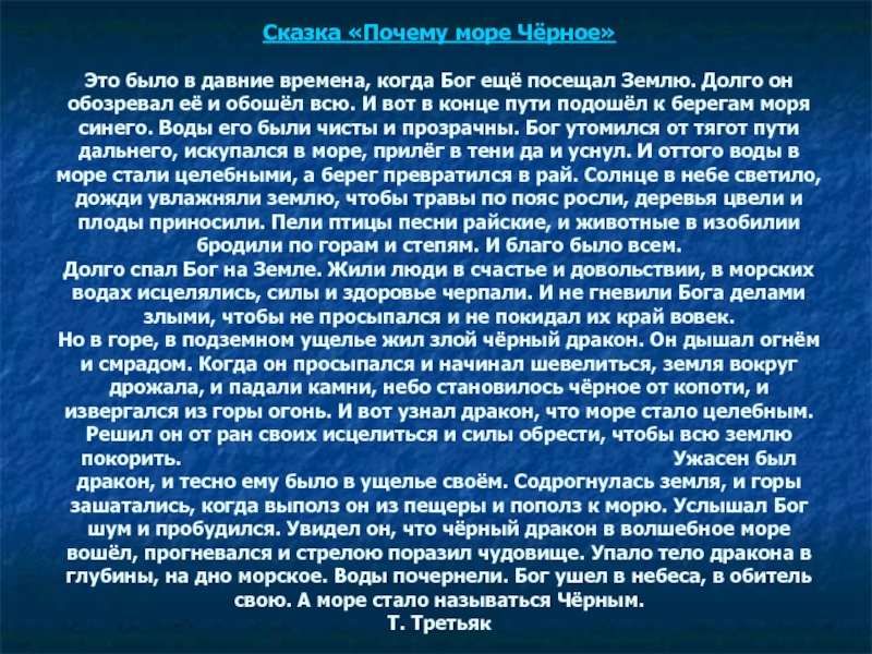 Но в горе, в подземном ущелье жил злой чёрный дракон. Он дышал огнём и смрадом. Когда он просыпался и начинал шевелиться, земля вокруг дрожала, и падали камни, небо становилось чёрное от копоти, и извергался из горы огонь. И вот узнал дракон, что море стало целебным. Решил он от ран своих исцелиться и силы обрести, чтобы всю землю покорить. Ужасен был дракон, и тесно ему было в ущелье своём. Содрогнулась земля, и горы зашатались, когда выполз он из пещеры и пополз к морю. Услышал Бог шум и пробудился. Увидел он, что чёрный дракон в волшебное море вошёл, прогневался и стрелою поразил чудовище. Упало тело дракона в глубины, на дно морское. Воды почернели. Бог ушел в небеса, в обитель свою. А море стало называться Чёрным. Т. Третьяк