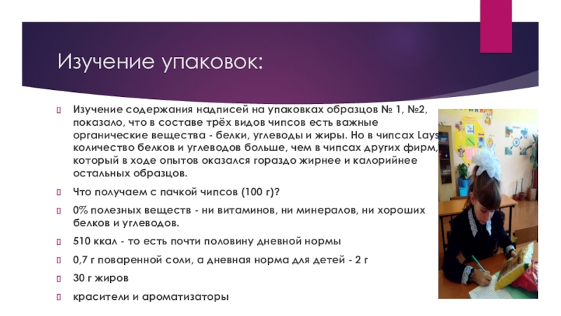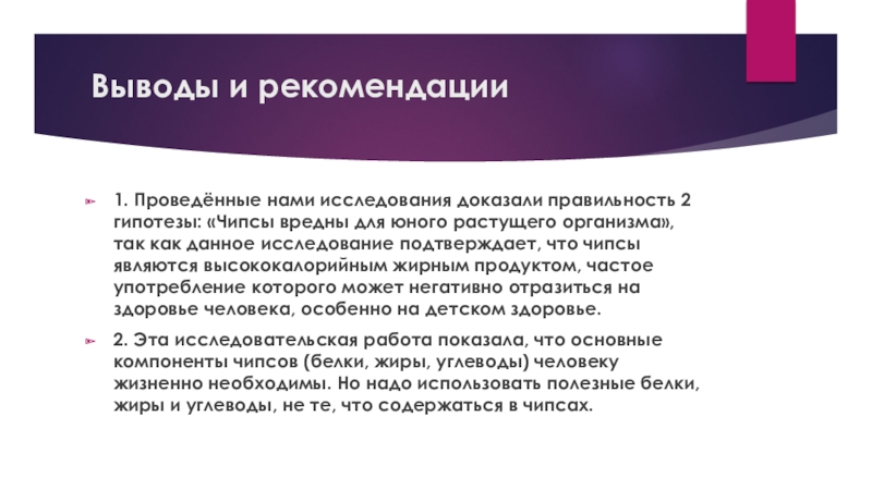 2. Эта исследовательская работа показала, что основные компоненты чипсов (белки, жиры, углеводы) человеку жизненно необходимы. Но надо использовать полезные белки, жиры и углеводы, не те, что содержаться в чипсах.