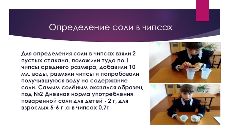 стакана, положили туда по 1 чипсы среднего размера, добавили 10 мл. воды, размяли чипсы и попробовали получившуюся воду на содержание соли. Самым солёным оказался образец под №2 Дневная норма употребления поваренной соли для детей - 2 г, для взрослых 5-6 г ,а в чипсах 0,7г