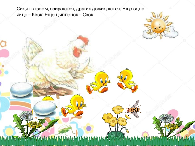Сидят втроем, озираются, других дожидаются. Еще одно яйцо – Квок! Еще цыпленок – Скок!