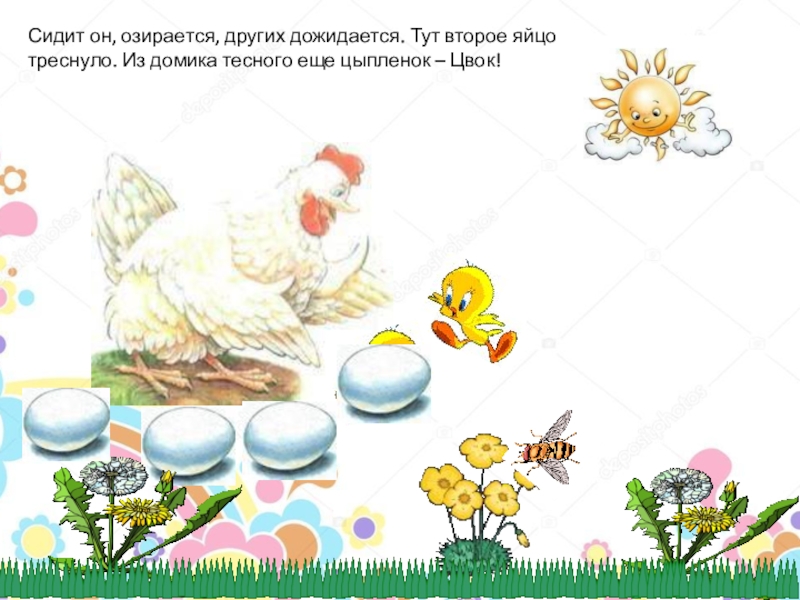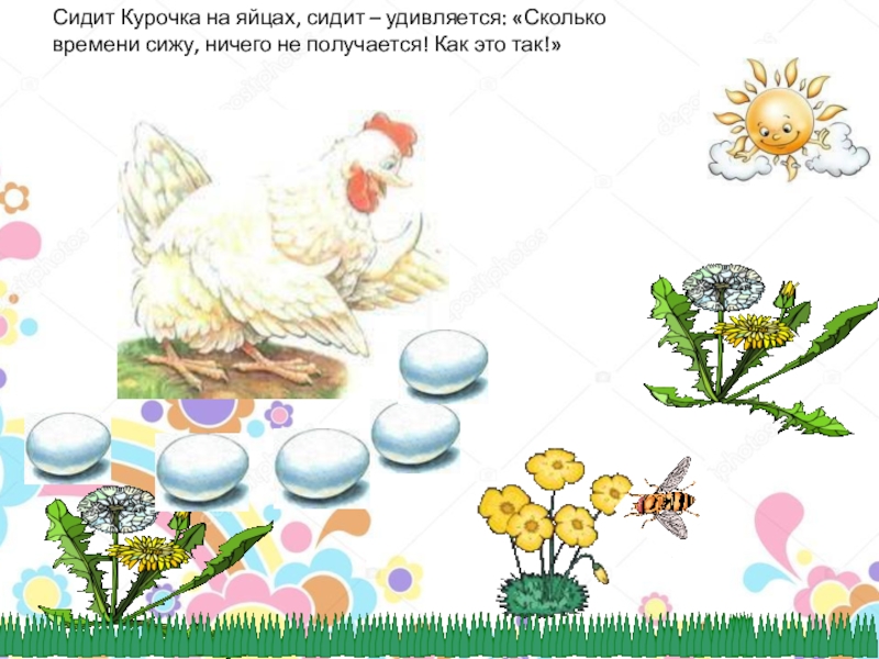 Слайд 5Сидит Курочка на яйцах, сидит – удивляется: «Сколько времени сижу, ничего