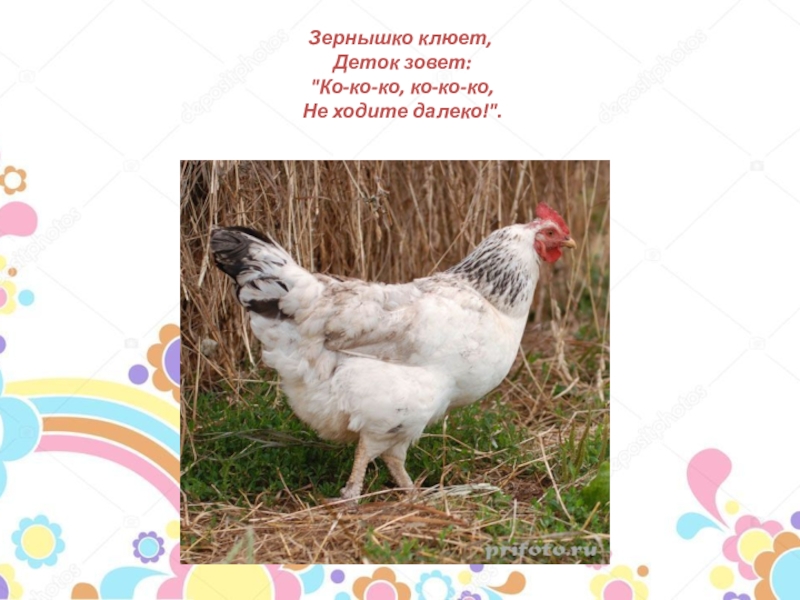 Слайд 4Зернышко клюет, Деток зовет: "Ко-ко-ко, ко-ко-ко, Не ходите далеко!".
