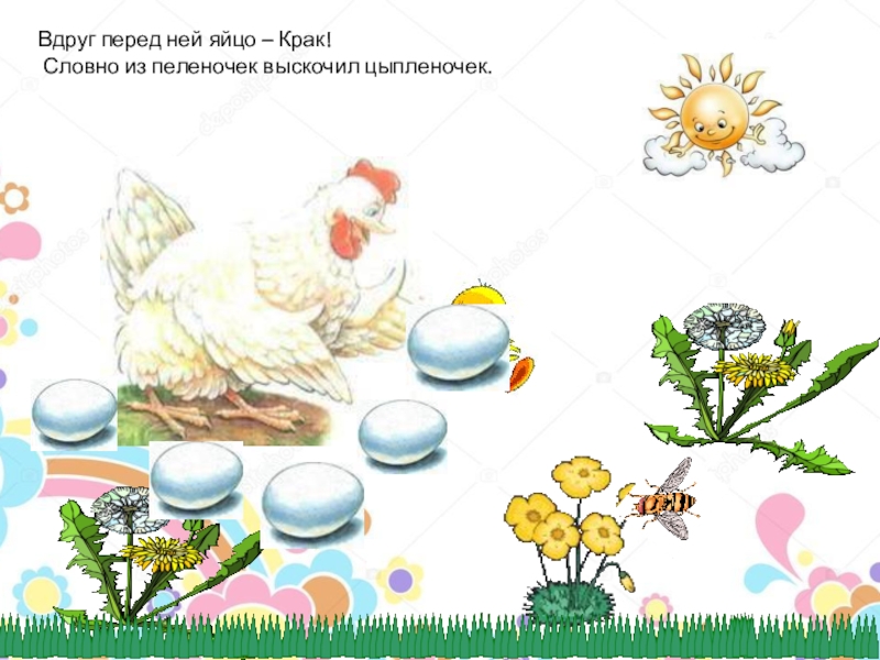 Вдруг перед ней яйцо – Крак! Словно из пеленочек выскочил цыпленочек.