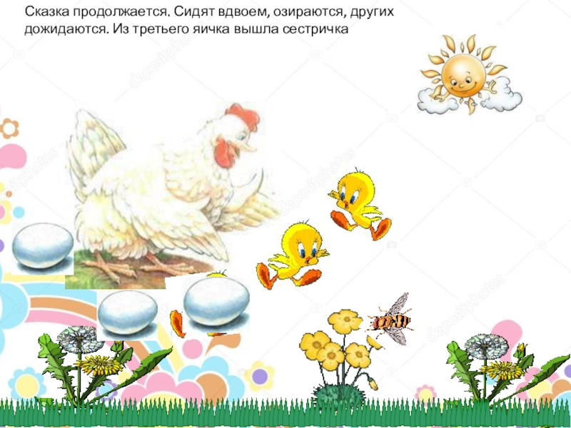 Слайд 8Сказка продолжается. Сидят вдвоем, озираются, других дожидаются. Из третьего яичка вышла