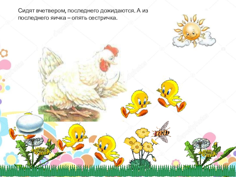 Слайд 10Сидят вчетвером, последнего дожидаются. А из последнего яичка – опять сестричка.