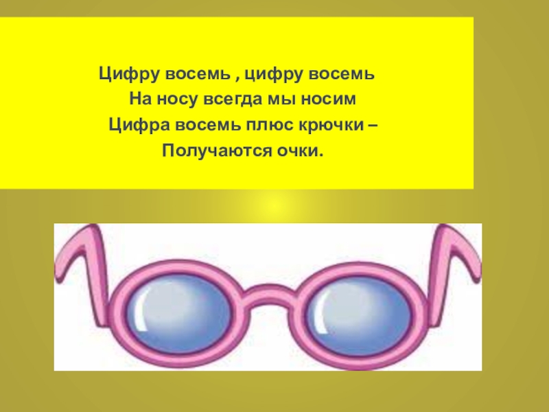 Цифру восемь , цифру восемь  На носу всегда мы носим  Цифра восемь плюс крючки –