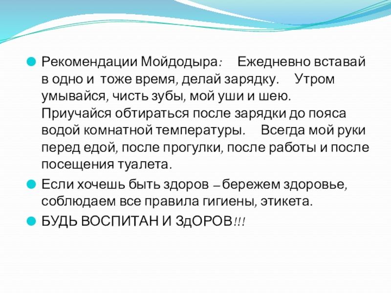 Рекомендации Мойдодыра:     Ежедневно вставай в одно и  тоже время, делай зарядку.     Утром умывайся, чисть зубы, мой уши и шею.     Приучайся обтираться после зарядки до пояса водой комнатной температуры.     Всегда мой руки перед