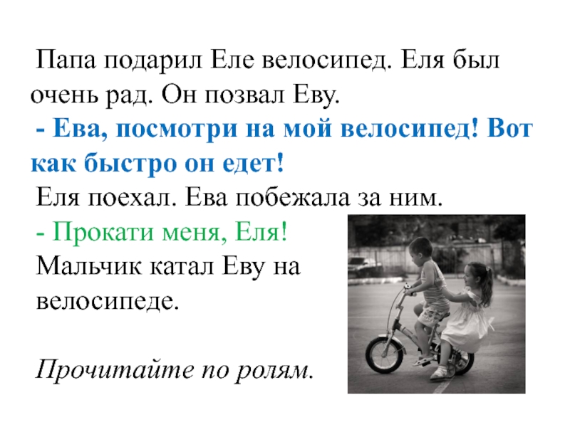Папа подарил Еле велосипед. Еля был очень рад. Он позвал Еву. - Ева, посмотри на мой велосипед! Вот как быстро он едет!Еля поехал. Ева побежала за ним.- Прокати меня, Еля!Мальчик катал Еву на велосипеде.Прочитайте по ролям.