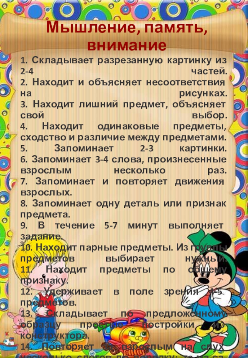 15. Точно выполняет задание, состоящее из 3-4 команд.