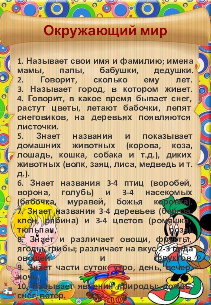 1. Называет свои имя и фамилию; имена мамы, папы, бабушки,
