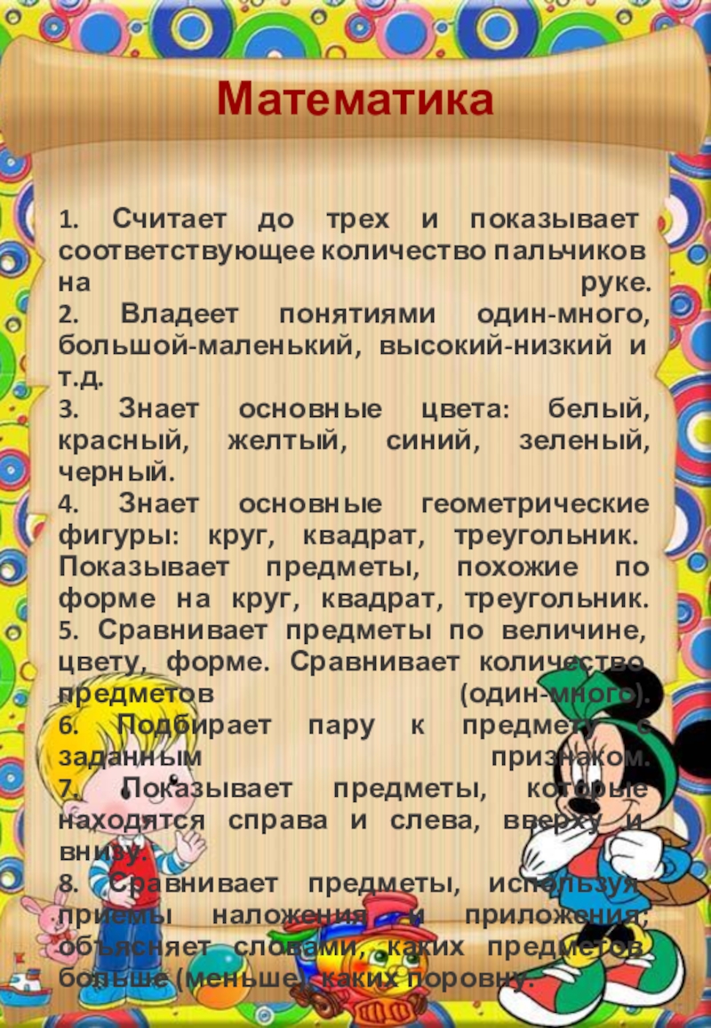 5. Сравнивает предметы по величине, цвету, форме. Сравнивает количество предметов (один-много).