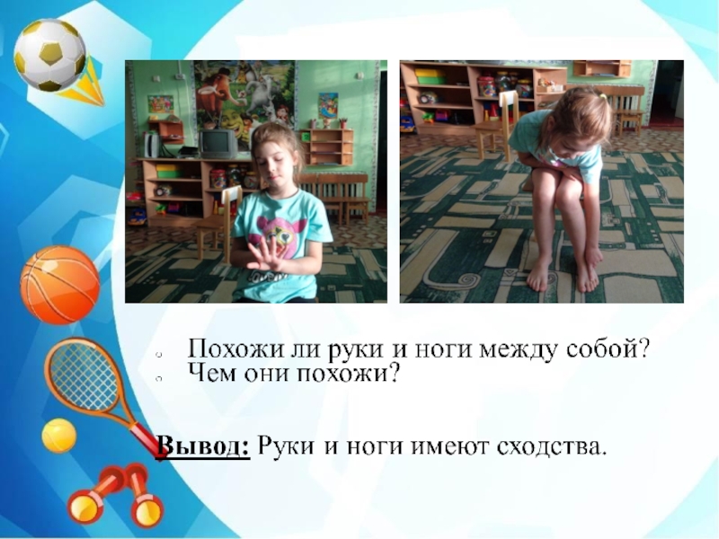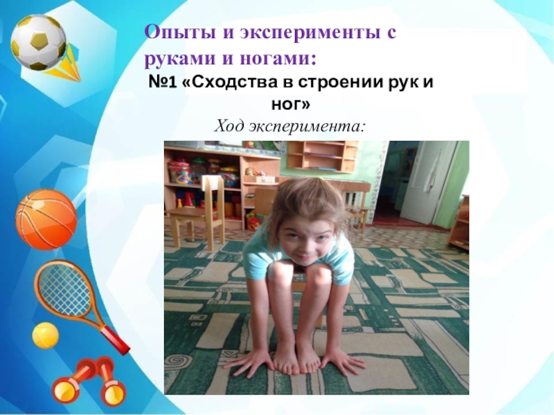 Слайд 8Опыты и эксперименты с руками и ногами: