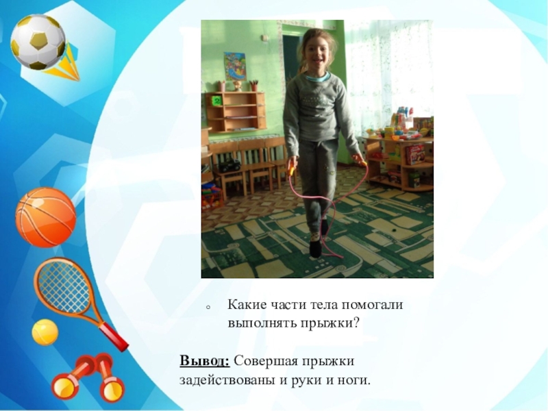 Слайд 19Какие части тела помогали выполнять прыжки?