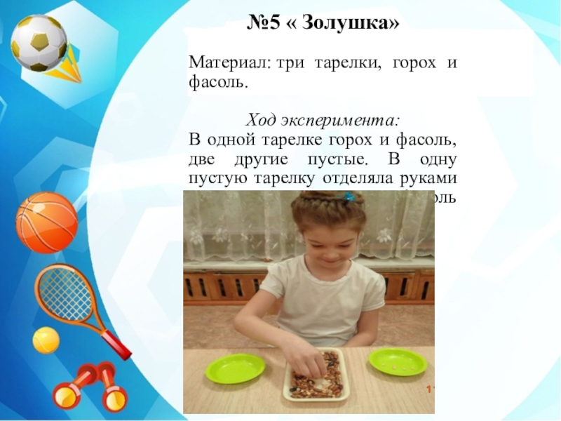 №5 « Золушка»Материал: три тарелки, горох и фасоль.Ход эксперимента:В одной тарелке горох и фасоль, две другие пустые. В