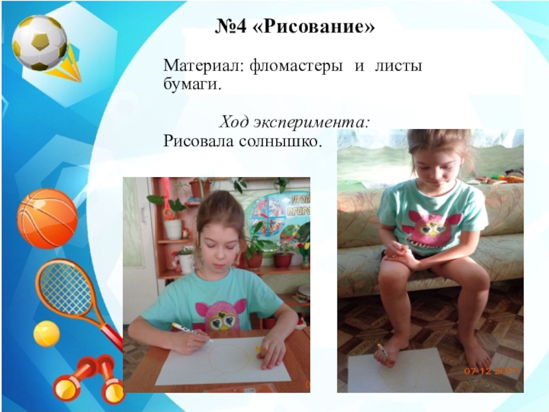 №4 «Рисование»Материал: фломастеры и листы бумаги.Ход эксперимента:Рисовала солнышко.