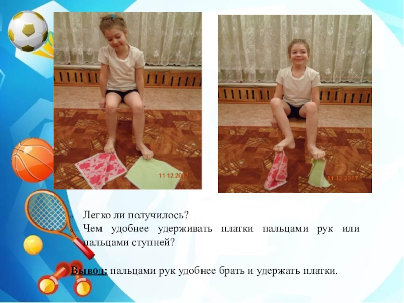 Легко ли получилось? Чем удобнее удерживать платки пальцами рук или пальцами ступней?Вывод: пальцами рук удобнее брать и удержать