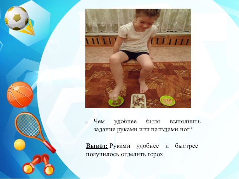 Чем удобнее было выполнить задание руками или пальцами ног?Вывод: Руками удобнее и быстрее получилось отделить горох.