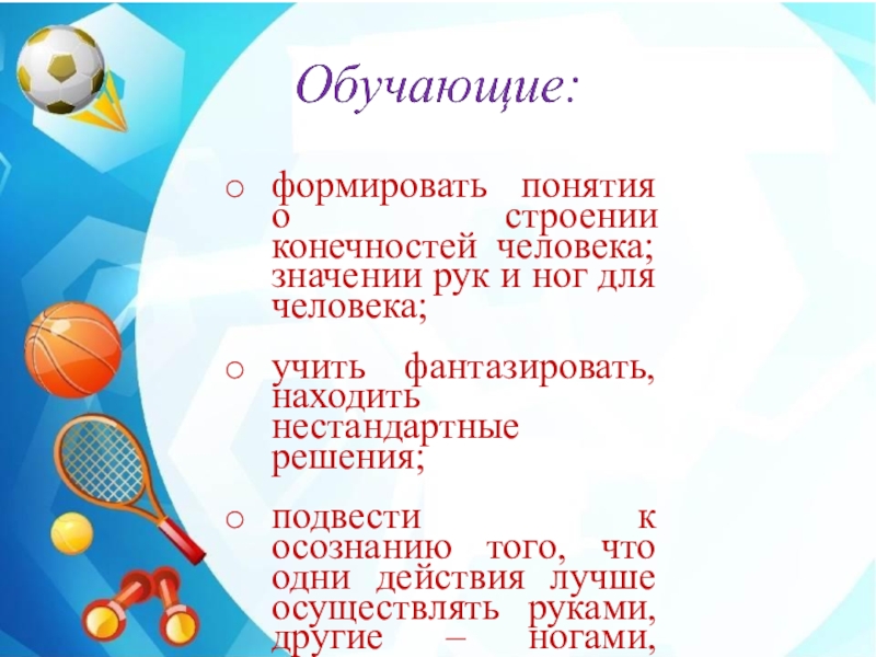 Слайд 4формировать понятия о строении конечностей человека; значении рук и ног для