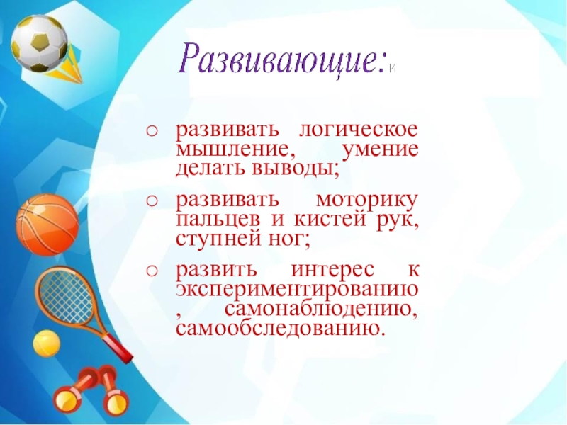 развивать логическое мышление, умение делать выводы; развивать моторику пальцев и кистей рук, ступней ног; развить интерес к