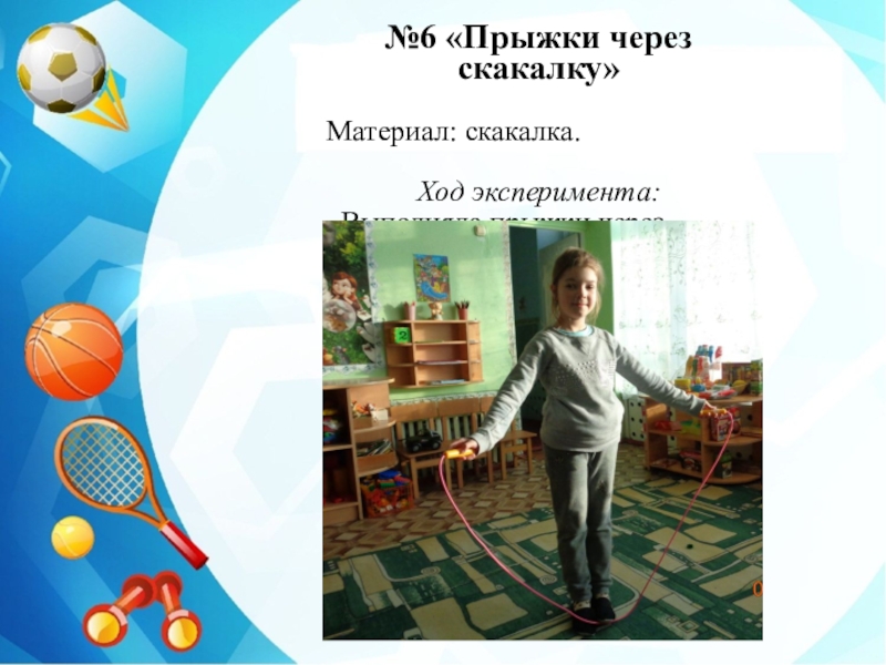 №6 «Прыжки через скакалку»Материал: скакалка.Ход эксперимента: Выполняла прыжки через скакалку.