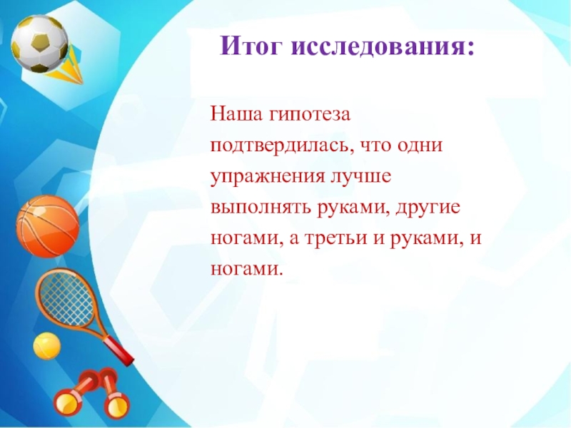 Итог исследования: Наша гипотеза подтвердилась, что одни упражнения лучше выполнять руками, другие ногами, а третьи и руками,