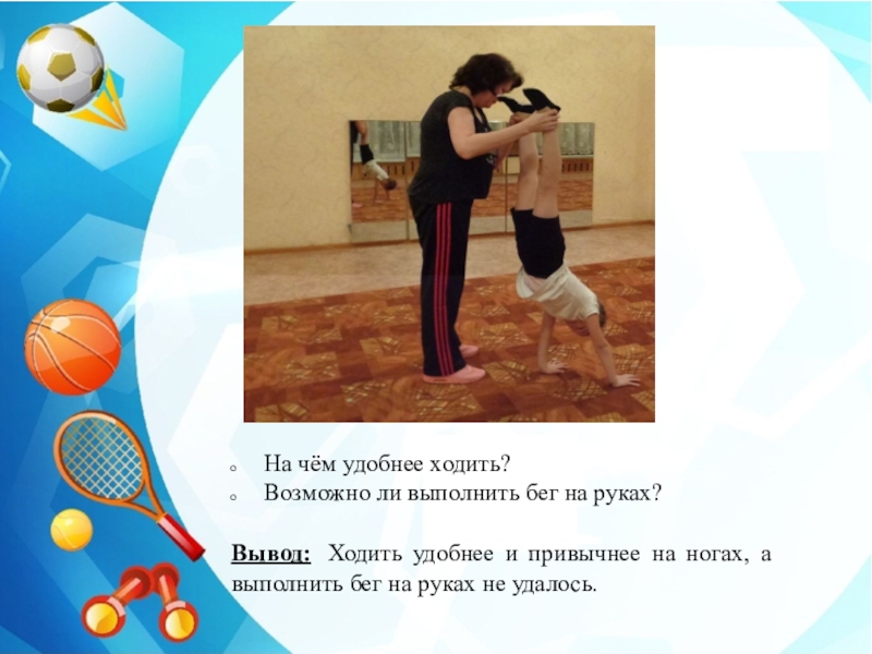 На чём удобнее ходить?Возможно ли выполнить бег на руках?Вывод:  Ходить удобнее и привычнее на ногах, а выполнить