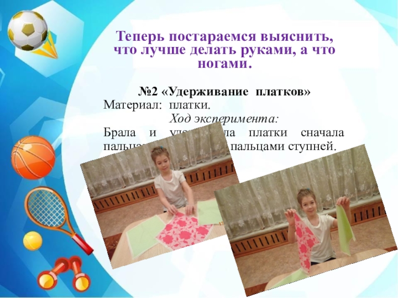 Теперь постараемся выяснить, что лучше делать руками, а что ногами. №2 «Удерживание платков»Материал:  платки.Ход эксперимента:Брала и удерживала платки