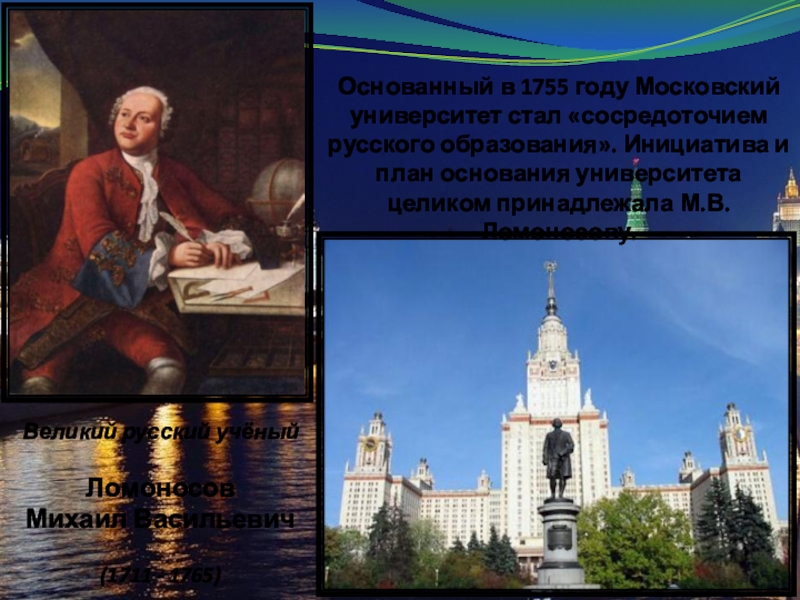 университет стал «сосредоточием русского образования». Инициатива и план основания университета целиком принадлежала М.В.Ломоносову.