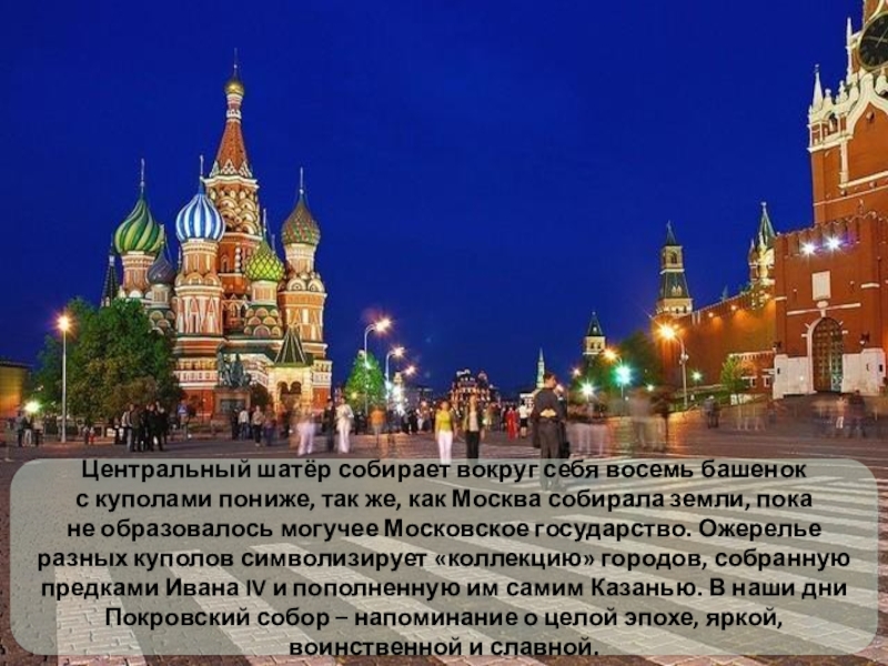 не образовалось могучее Московское государство. Ожерелье разных куполов символизирует «коллекцию» городов, собранную предками Ивана IV и пополненную им самим Казанью. В наши дни Покровский собор – напоминание о целой эпохе, яркой, воинственной и славной.