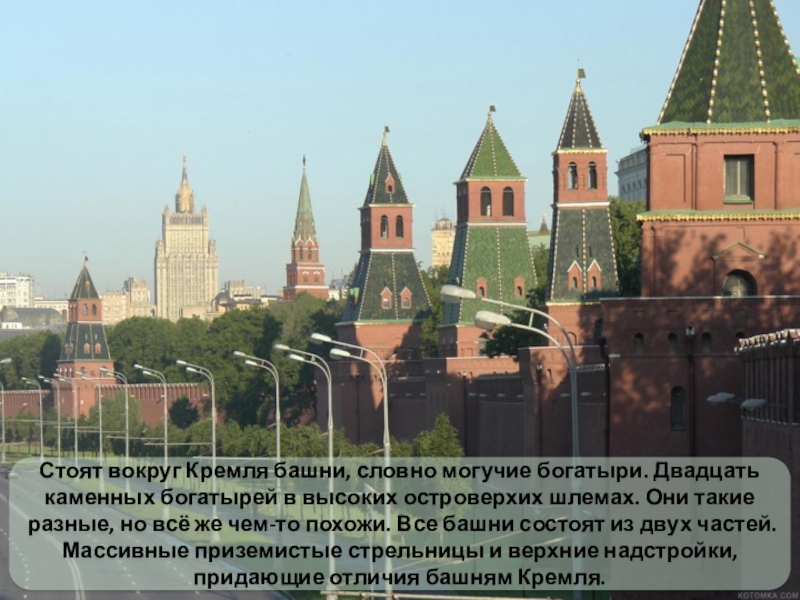 Слайд 13Стоят вокруг Кремля башни, словно могучие богатыри. Двадцать каменных богатырей в