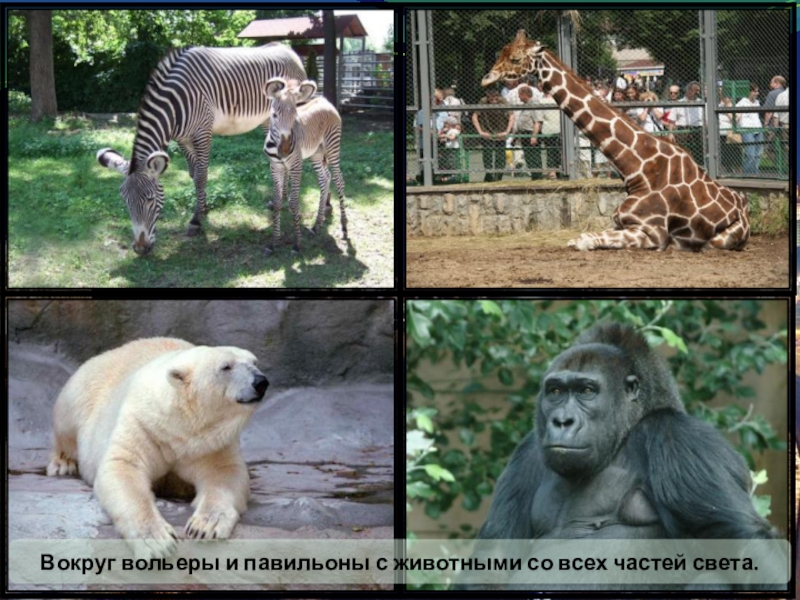 Слайд 18Вокруг вольеры и павильоны с животными со всех частей света.