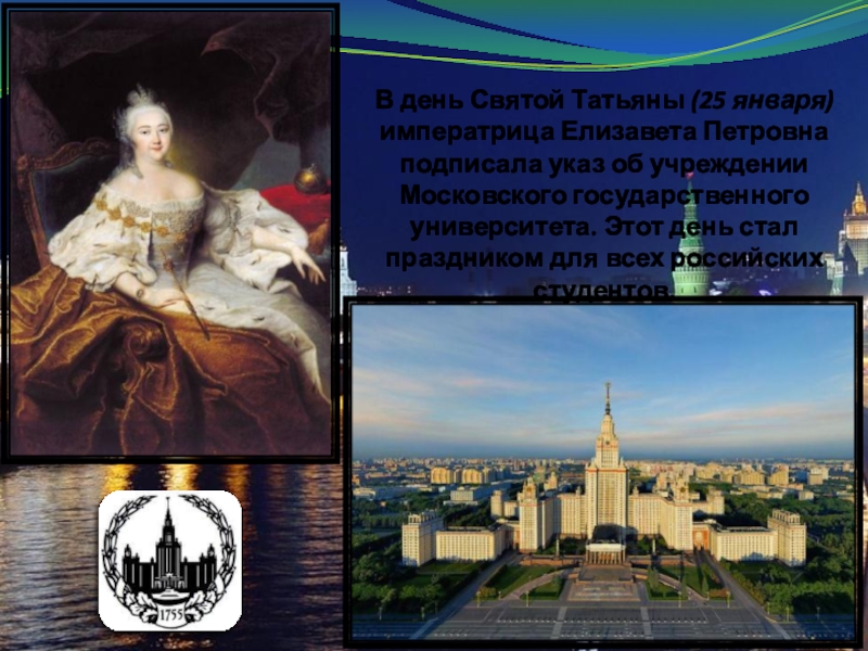 Слайд 30В день Святой Татьяны (25 января) императрица Елизавета Петровна подписала указ