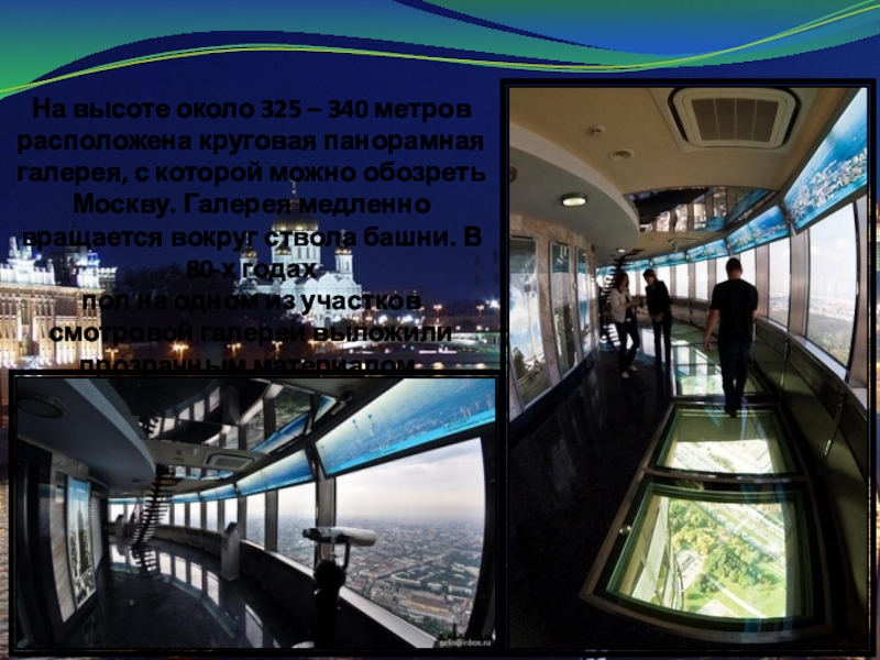Слайд 27На высоте около 325 – 340 метров расположена круговая панорамная галерея,