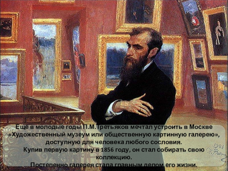 Слайд 22Ещё в молодые годы П.М.Третьяков мечтал устроить в Москве «Художественный музеум
