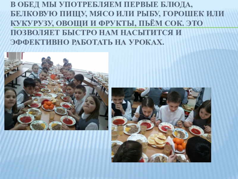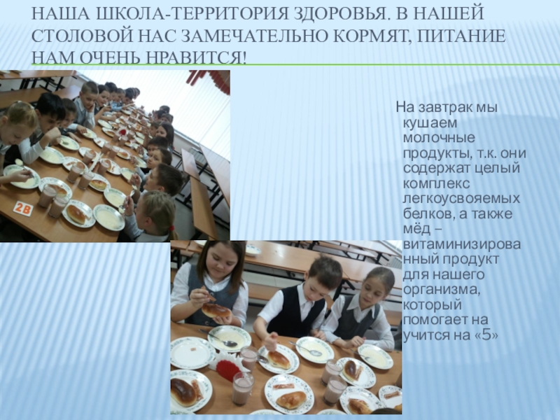 На завтрак мы кушаем молочные продукты, т.к. они содержат целый комплекс легкоусвояемых белков, а также мёд – витаминизированный продукт для нашего организма, который помогает на учится на «5»