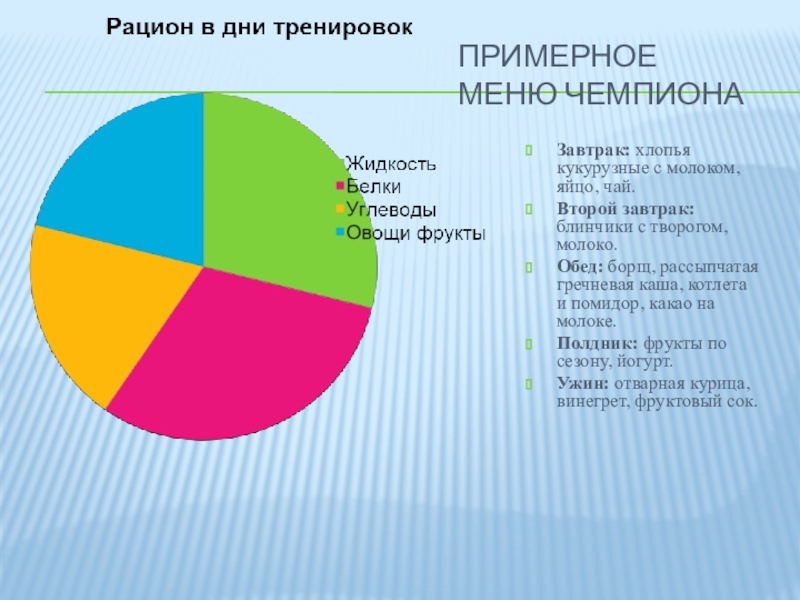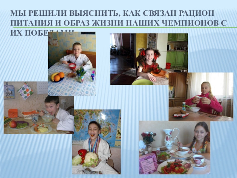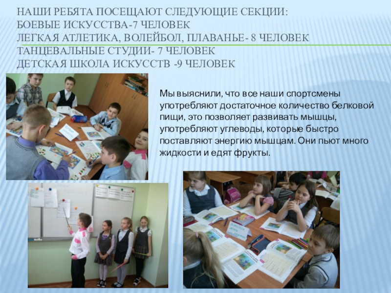 Мы выяснили, что все наши спортсмены употребляют достаточное количество белковой пищи, это позволяет развивать мышцы, употребляют углеводы, которые быстро поставляют энергию мышцам. Они пьют много жидкости и едят фрукты.