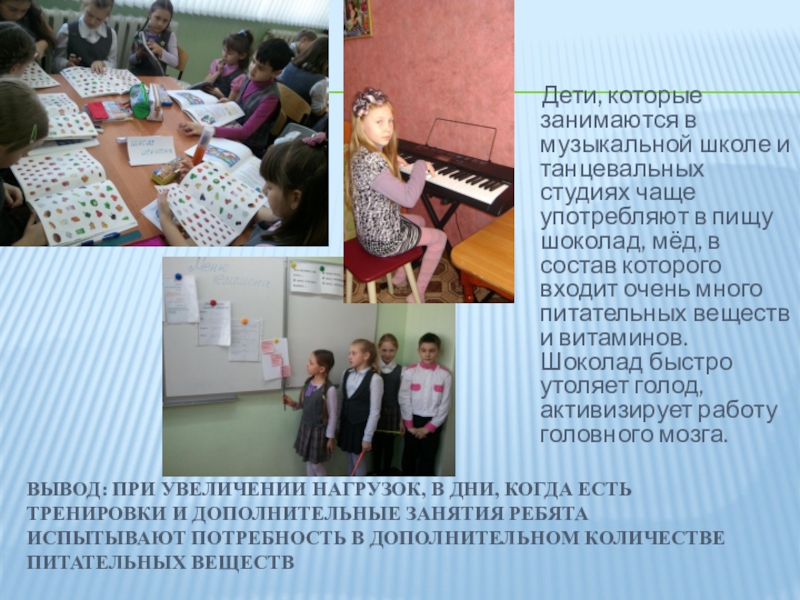 Дети, которые занимаются в музыкальной школе и танцевальных студиях чаще употребляют в пищу шоколад, мёд, в состав которого входит очень много питательных веществ и витаминов. Шоколад быстро утоляет голод, активизирует работу головного мозга.