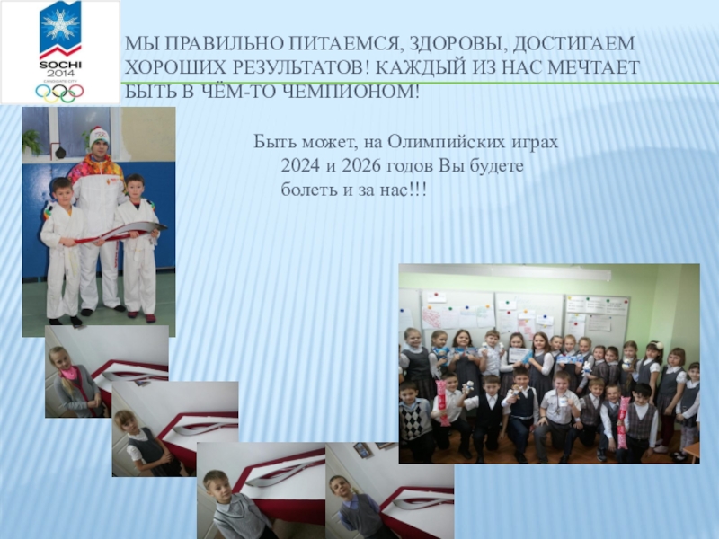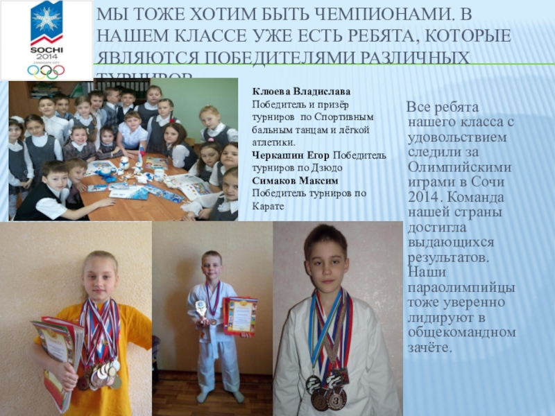 Все ребята нашего класса с удовольствием следили за Олимпийскими играми в Сочи 2014. Команда нашей страны достигла выдающихся результатов. Наши параолимпийцы тоже уверенно лидируют в общекомандном зачёте.