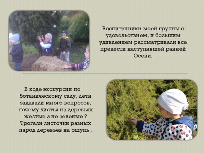В ходе экскурсии по ботаническому саду, дети задавали много вопросов, почему листья на деревьях желтые а не зеленые ? Трогали листочки разных парод деревьев на ощупь .
