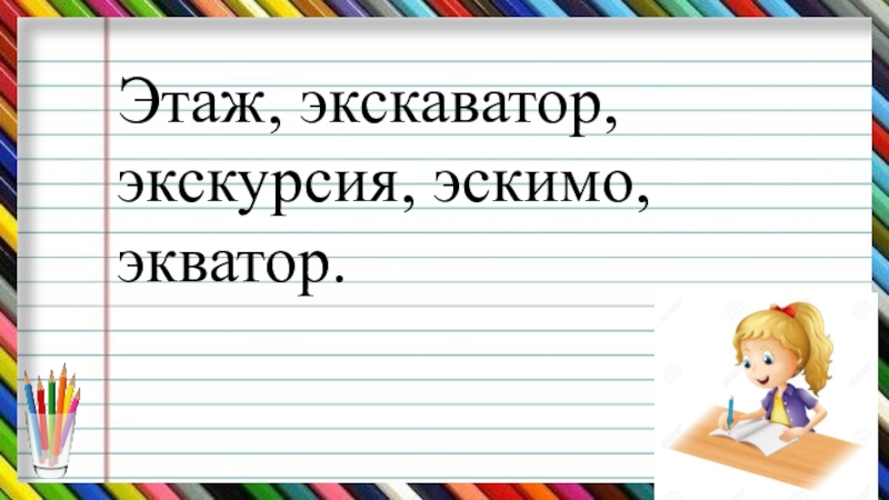 Слайд 6Этаж, экскаватор, экскурсия, эскимо, экватор.