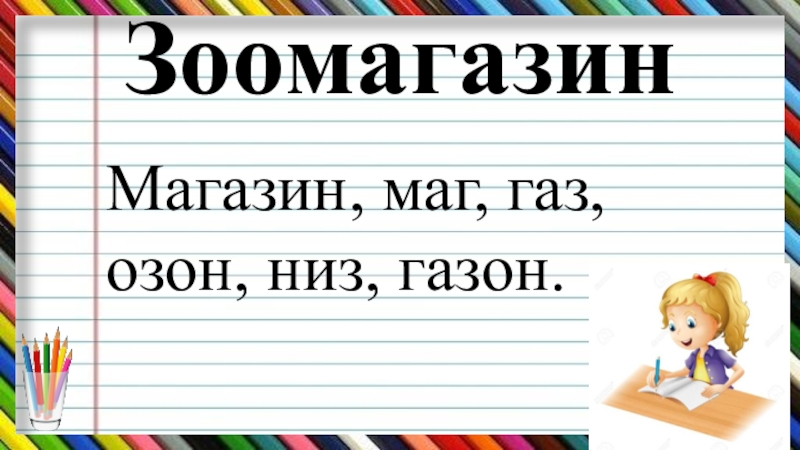 Зоомагазин Магазин, маг, газ, озон, низ, газон.