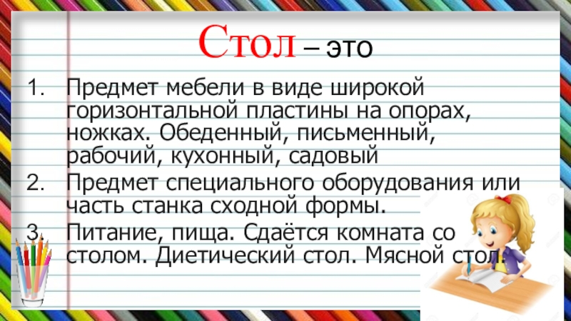 Стол – это Предмет мебели в виде широкой горизонтальной пластины на опорах, ножках. Обеденный, письменный, рабочий, кухонный,