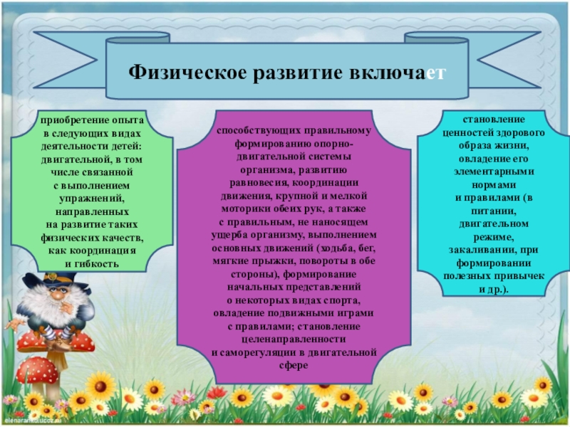 способствующих правильному формированию опорно-двигательной системы организма, развитию равновесия, координации движения, крупной и мелкой моторики обеих рук, а также с правильным, не наносящем ущерба организму, выполнением основных движений (ходьба, бег, мягкие прыжки, повороты в обе стороны), формирование начальных представлений о некоторых видах спорта, овладение подвижными играми с правилами; становление целенаправленности и саморегуляции в двигательной сфере