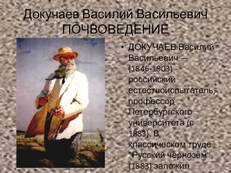 Докучаев Василий Васильевич ПОЧВОВЕДЕНИЕДОКУЧАЕВ Василий Васильевич — (1846-1903) - российский естествоиспытатель, профессор Петербургского университета (с 1883). В
