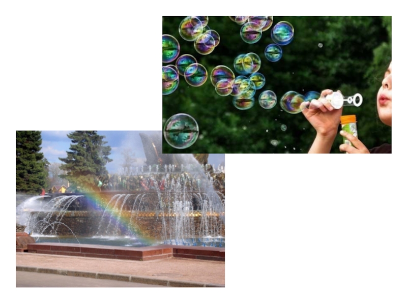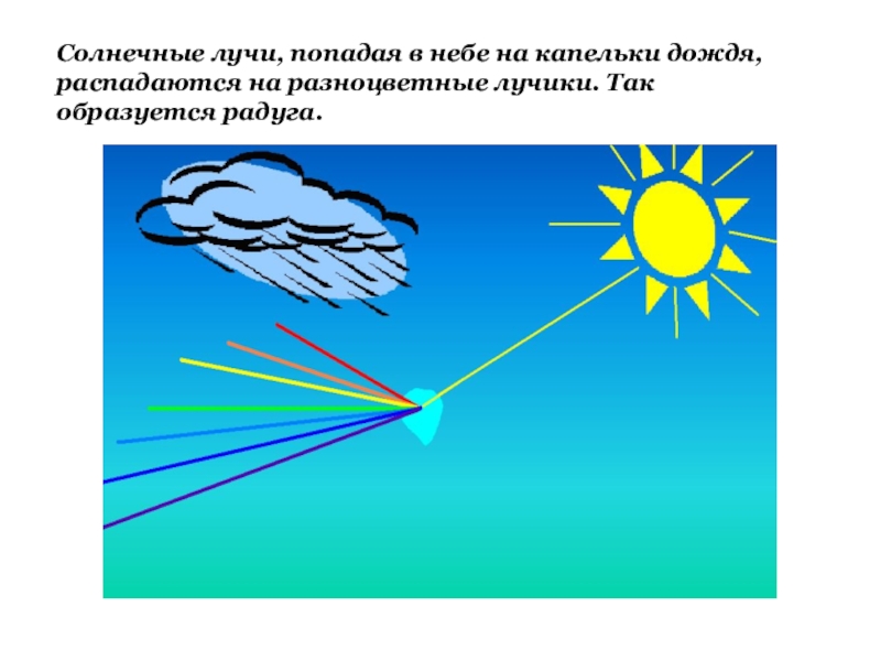 Слайд 5Солнечные лучи, попадая в небе на капельки дождя, распадаются на разноцветные