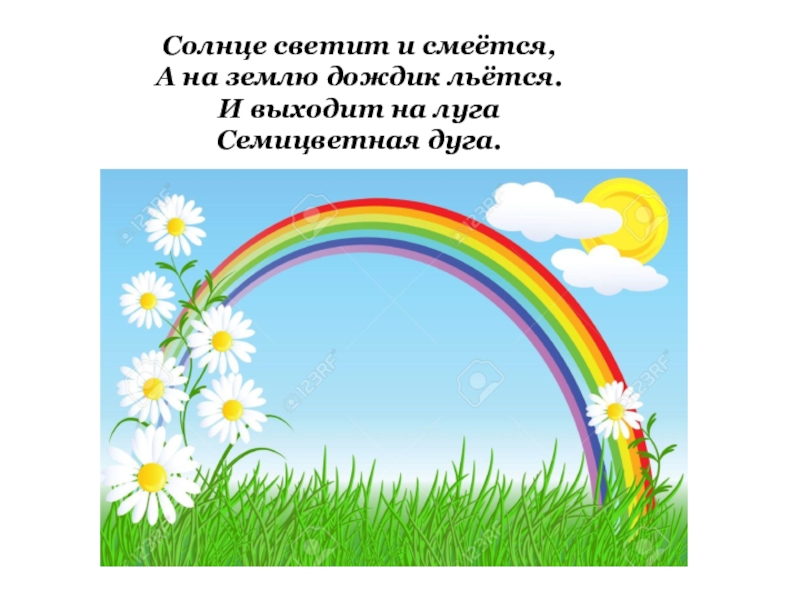 Слайд 3Солнце светит и смеётся, А на землю дождик льётся. И выходит на луга Семицветная