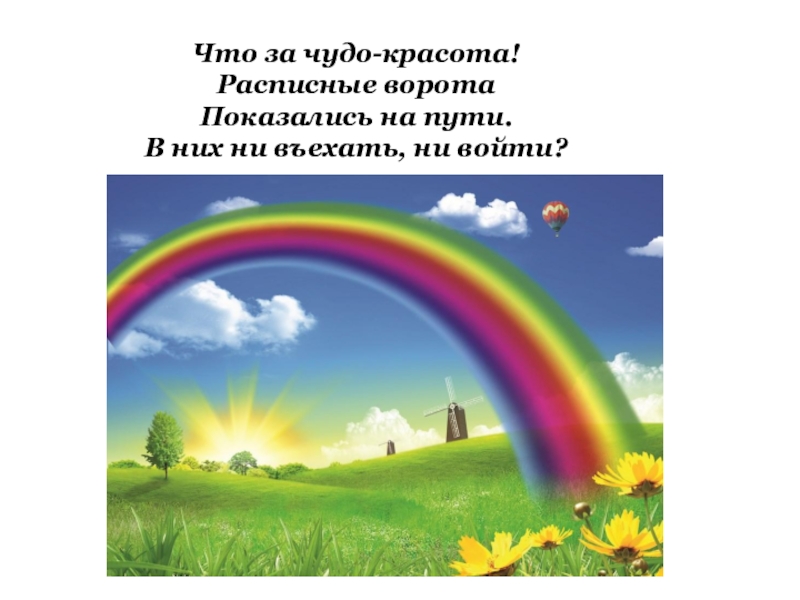 Солнце светит и смеётся, А на землю дождик льётся. И выходит на луга Семицветная дуга.