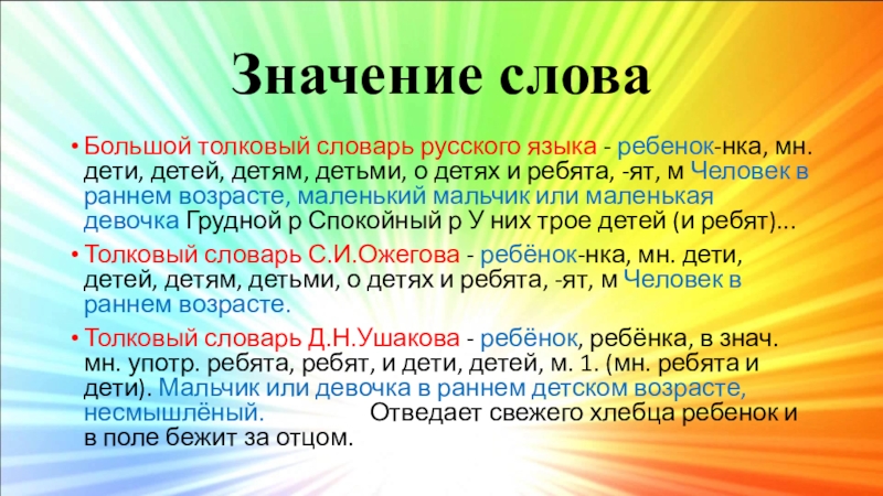 Значение словаБольшой толковый словарь русского языка - ребенок-нка, мн. дети, детей, детям, детьми, о детях и ребята, -ят, м Человек в раннем возрасте, маленький мальчик или маленькая девочка Грудной р Спокойный р У них трое детей